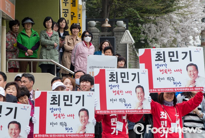(천안=포커스뉴스) 6일 오후 충남 천안 두정로에서 열린 최민기 새누리당 천안시을 후보 지원유세에서 유권자들이 연설을 듣고 있다.