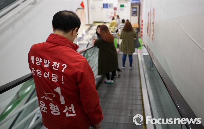 (인천=포커스뉴스) 제20대 총선에 출마한 윤형선 새누리당 계양을 후보가 6일 오후 인천 계양구 홈플러스 계산점에서 선거운동을 하고 있다.