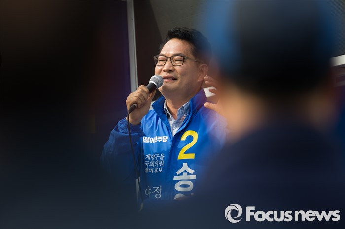 (인천=포커스뉴스) 제20대 총선에 출마한 송영길 더불어민주당 계양을 후보가 6일 오후 인천 계양구 계산역 앞에서 선거운동을 하고 있다.