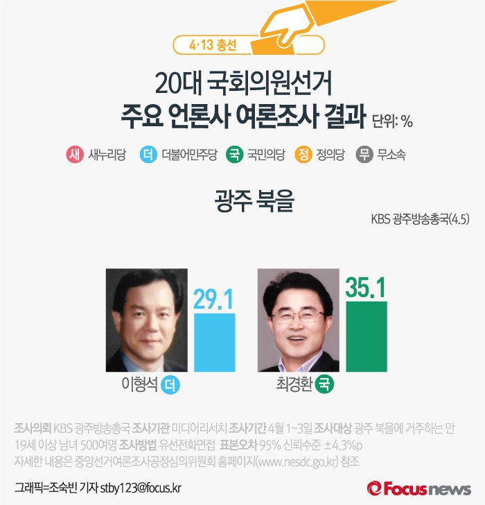 (서울=포커스뉴스) KBS 광주방송총국이 미디어리서치에 의뢰해 5일 발표한 결과에 따르면 광주 북을에서 더민주 이형석 후보의 지지율은 29.1%, 국민의당 최경환 후보의 지지율은 35.1%인 것으로 나타났다.