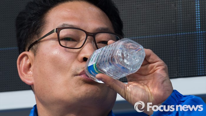 (인천=포커스뉴스) 제20대 총선에 출마한 송영길 더불어민주당 계양을 후보가 6일 오후 인천 계양구 계산역 앞에서 선거운동 중 물을 마시고 있다.
