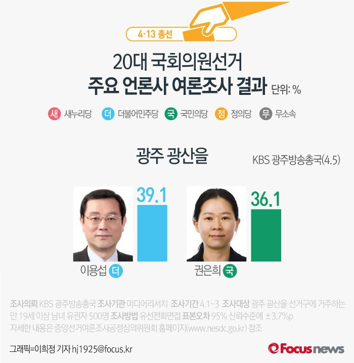 (서울=포커스뉴스) KBS 광주방송총국이 미디어리서치에 의뢰해 5일 발표한 광주 광산을 여론조사 결과에 따르면 더불어민주당 이용섭 후보의 지지율은 39.1%, 국민의당 권은희 후보는 36.1%를 기록했다.