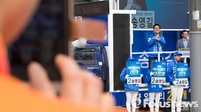 (인천=포커스뉴스) 제20대 총선에 출마한 송영길 더불어민주당 계양을 후보가 6일 오후 인천 계양구 계산역 앞에서 선거운동을 하고 있다.