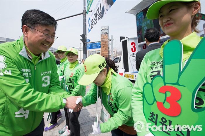 (인천=포커스뉴스) 제20대 총선에 출마한 최원식 국민의당 계양을 후보가 6일 오후 인천 계양구 계산역 앞에서 선거운동을 마친 뒤 선거운동원들과 악수하고 있다.