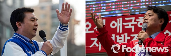 (서울=포커스뉴스) 허용범(오른쪽) 새누리당 동대문구갑 후보와 안규백 더불어민주당 동대문구갑 후보가 6일 오후 서울 동대문구 일대에서 유권자들에게 소중한 한 표를 호소 하고 있다.