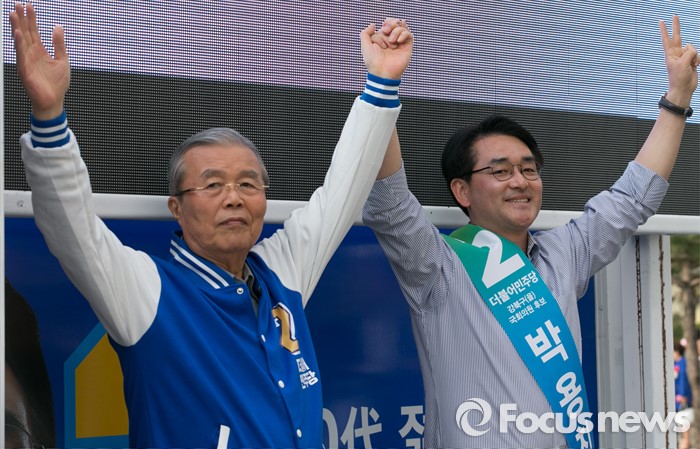 (서울=포커스뉴스) 6일 오후 서울 롯데백화점 미아점 앞에서 김종인(왼쪽) 더불어민주당 비대위 대표 겸 선대위원장과 박용진 강북을 후보가 손을 들어 인사하며 지지를 호소하고 있다.