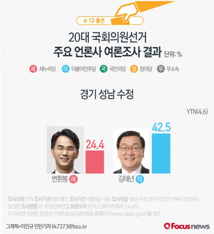 (서울=포커스뉴스) YTN이 여론조사기관 엠브레인에 의뢰해 6일 발표한 결과에 따르면 경기 성남 수정에서 새누리당 변환봉 후보의 지지율은 24.4%, 더불어민주당 김태년 후보 지지율은 42.5%인 것으로 나타났다.