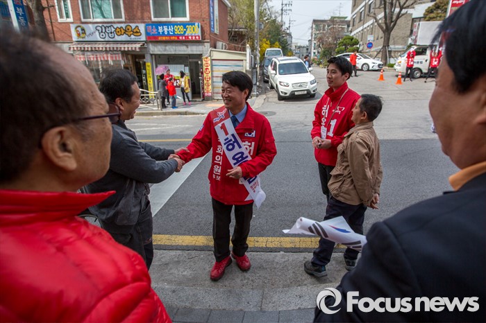 (서울=포커스뉴스) 허용범 새누리당 동대문구갑 후보가 6일 오후 서울 동대문구 제기동 일대에서 유세에 앞서 유권자들과 인사를 나누고 있다.