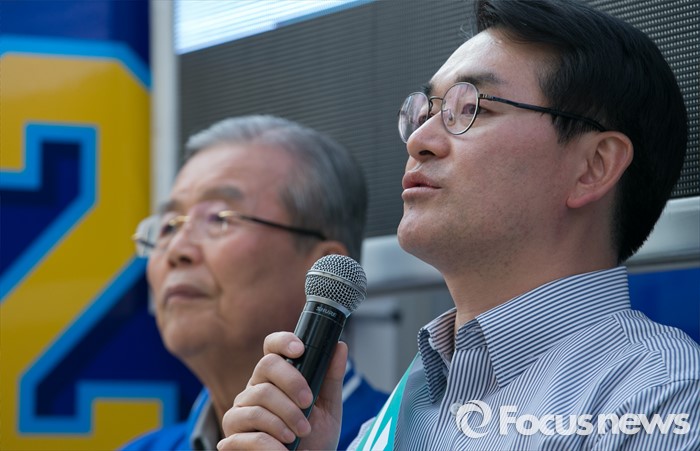 (서울=포커스뉴스) 6일 오후 서울 롯데백화점 미아점 앞에서 박용진 더불어민주당 강북을 후보가 지지를 호소하고 있다. 왼쪽은 김종인 비대위 대표 겸 선대위원장.