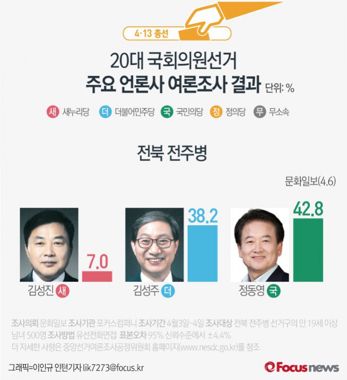 (서울=포커스뉴스) 문화일보가 여론조사기관 포커스컴퍼니에 의뢰해 6일 발표한 결과에 따르면 전북 전주병의 지지율은 새누리당 김성진 후보(7.0%), 더불어민주당 김성주 후보(38.2%), 국민의당 정동영 후보(42.8%)순인 것으로 나타났다.