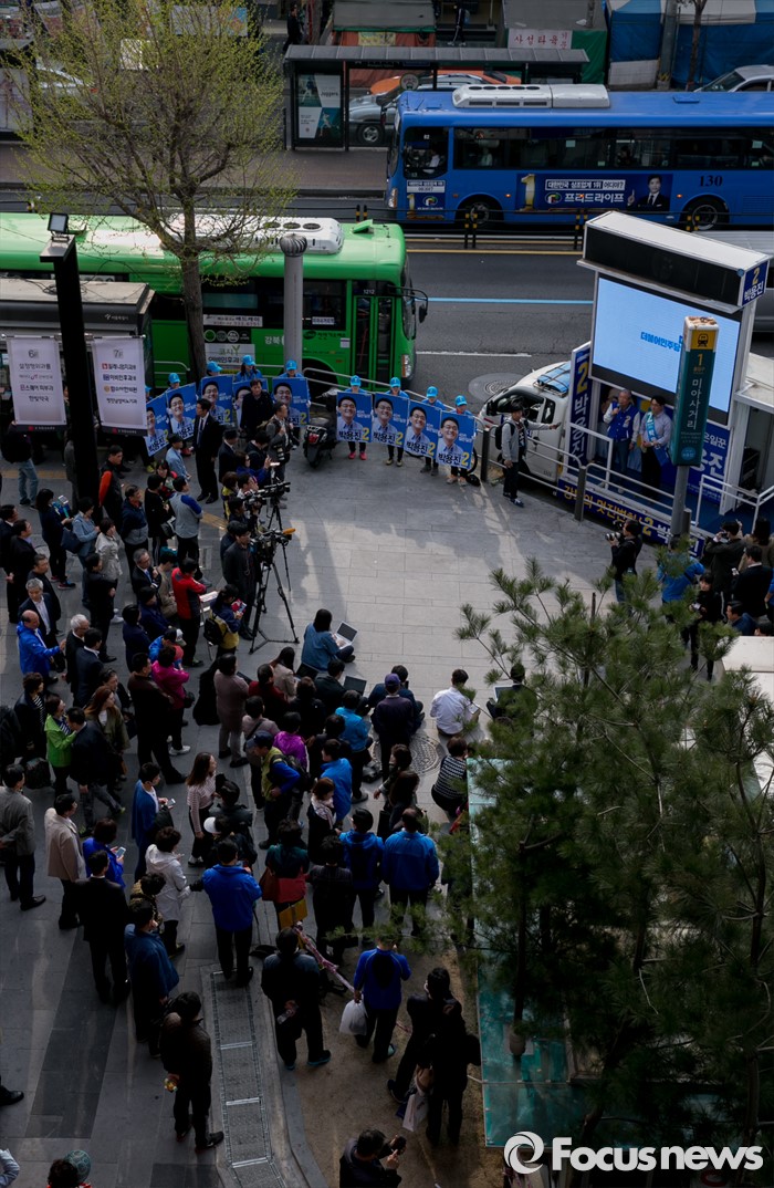 (서울=포커스뉴스) 6일 오후 서울 롯데백화점 미아점 앞에서 김종인 더불어민주당 비대위 대표 겸 선대위원장이 박용진 강북을 후보의 지지를 호소하고 있다.