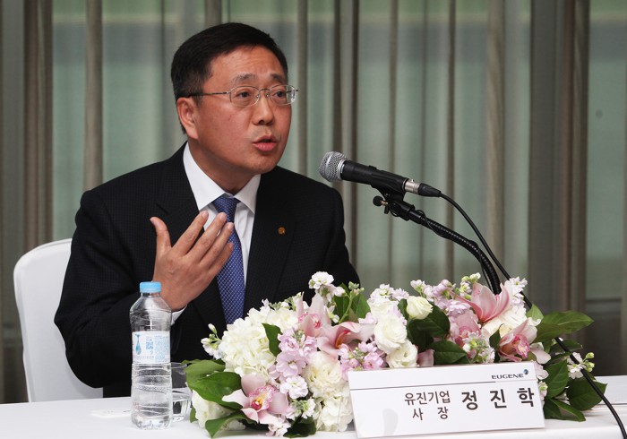 앞서 정진학 유진기업 사장은 지난달 22일 서울 여의도 콘래드호텔에서 열린 기자간담회에서 "현재 약 10%인 동양 보유 지분을 25%까지 늘릴 것"이라며 "그 정도 지분은 가져야 안정적인 경영권을 확보할 수 있다"고 밝힌 바 있다.유진기업 정진학 사장이 지난달 22일 서울 여의도 콘래드호텔에서 열린 기자간담회에서 ㈜동양 지분 매입에 대한 입장을 밝히고 있다.
