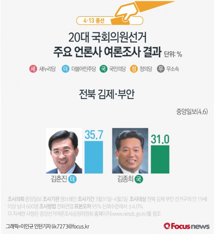 (서울=포커스뉴스) 4·13 총선이 7일 앞으로 다가온 가운데 전북 김제·부안에서 4선에 도전한 김춘진 더불어민주당 후보와 김종회 국민의당 후보가 접전을 펼치는 것으로 나타났다.