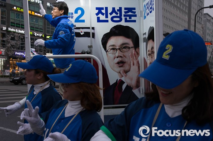 (서울=포커스뉴스) 20대 총선을 일주일 앞둔 6일 오후 서울 강서구 신방화역 인근에서 진성준 더불어민주당 강서구을 후보가 퇴근길 유세를 하고 있다.