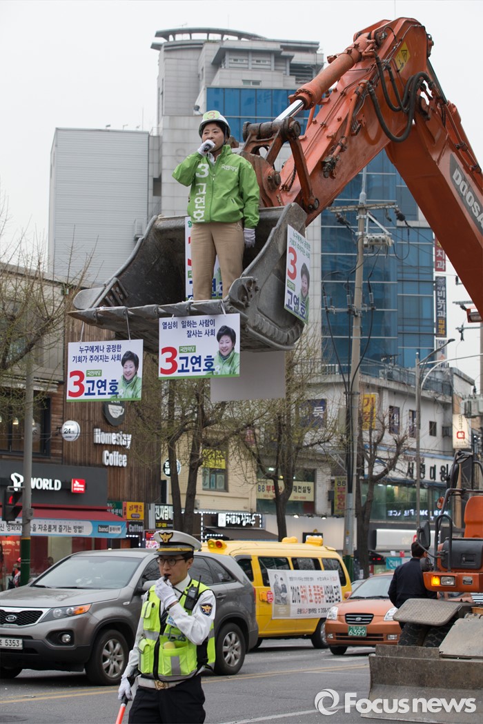 (서울=포커스뉴스) 6일 오후 서울 은평구 연신내 물빛공원에서 고연호 국민의당 은평구을 후보가 포클레인 위에서 유세를 하고 있다.