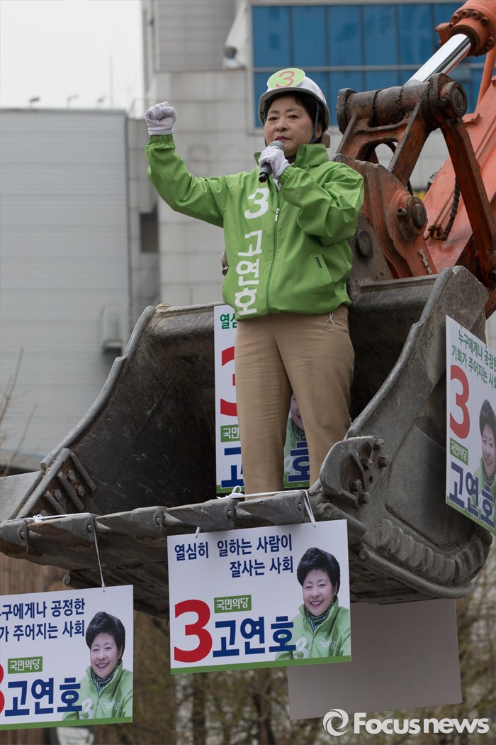 (서울=포커스뉴스) 6일 오후 서울 은평구 연신내 물빛공원에서 고연호 국민의당 은평구을 후보가 포클레인 위에서 유세를 하고 있다.