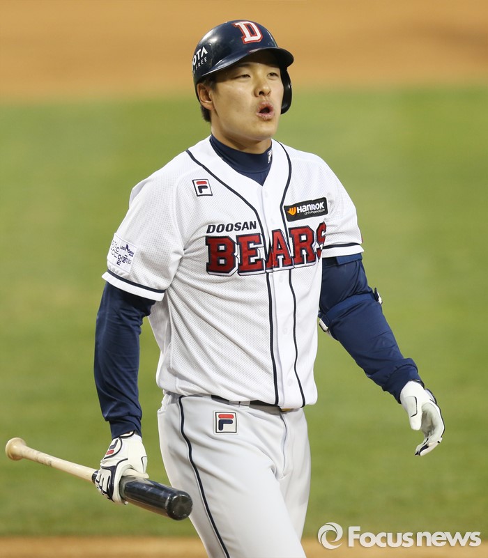 (서울=포커스뉴스) 6일 서울 잠실구장에서 열린 2016 프로야구 NC-두산 경기 1회말 1사 2루에서 두산 민병헌이 삼진 당하고 덕아웃으로 들어가고 있다.