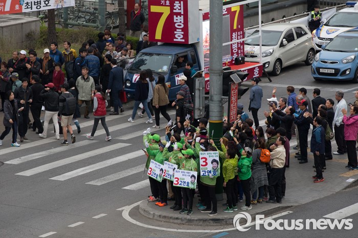 (서울=포커스뉴스) 고연호 국민의당 은평구을 후보가 6일 오후 서울 은평구 연신내 물빛공원에서 포클레인 위에 올라가 유세하는 모습을 지지자들과 시민들이 지켜보고 있다.