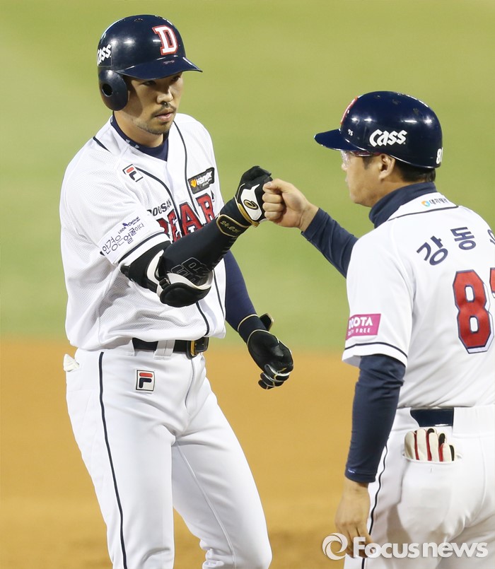 (서울=포커스뉴스) 6일 서울 잠실구장에서 열린 2016 프로야구 NC-두산 경기 2회말 무사 1루에서 두산 오재원이 우익수앞 안타를 치고 1루에서 강동우 코치와 주먹을 마주치고 있다.