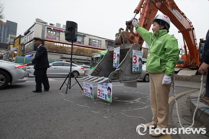 (서울=포커스뉴스) 6일 오후 서울 은평구 연신내 물빛공원에서 고연호 국민의당 은평구을 후보가 포클레인에 오르기전 안전모와 안전띠를 착용하고 시민들에게 지지를 호소하고 있다.
