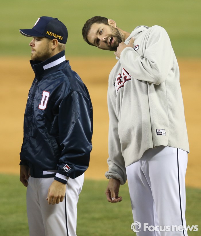 (서울=포커스뉴스) 6일 서울 잠실구장에서 열린 2016 프로야구 NC-두산 경기에서 NC에 2연승한 두산의 승리투수 보우덴(왼쪽)과 관중석의 부인을 향해 사랑의 표정을 짓고있는 니퍼트가 같이 서있다.