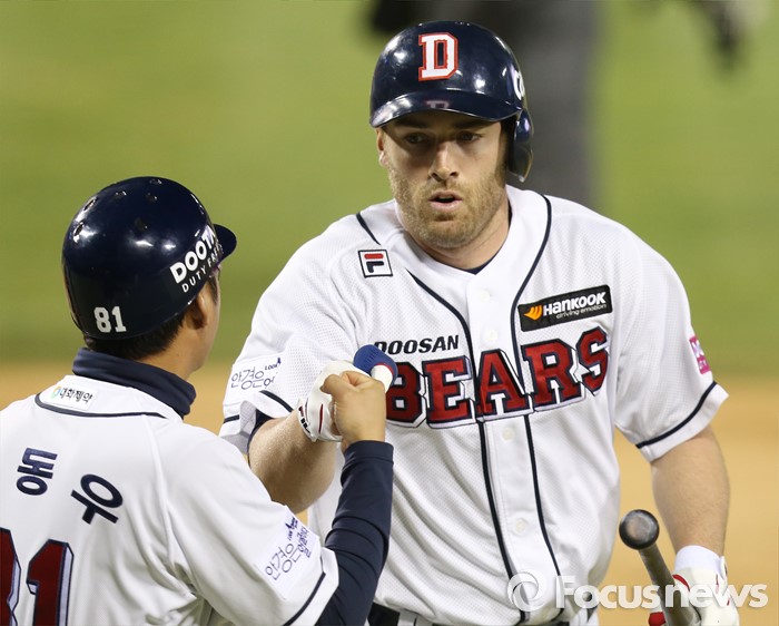 (서울=포커스뉴스) 6일 서울 잠실구장에서 열린 2016 프로야구 NC-두산 경기 6회말 1사후 두산 에반스가 우월 1점 홈런을 치고 홈인하며 강동우 코치의 환영을 받고 있다.