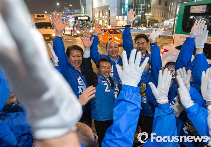 (서울=포커스뉴스) 6일 오후 서울 강동구 이마트 앞에서 심재권 후보가 김종인 더불어민주당 비대위 대표와 함께 유세를 펼치고 난 뒤 자원봉사자들과 함께 파이팅을 외치고 있다.