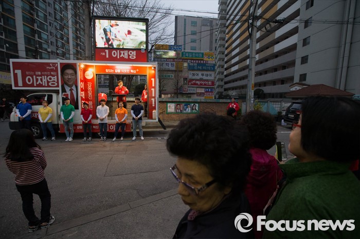 (서울=포커스뉴스) 6일 오후 서울 강동구 천호동 인근의 한 아파트 앞에서 이재영 새누리당 후보가 유세를 펼치고 있다.