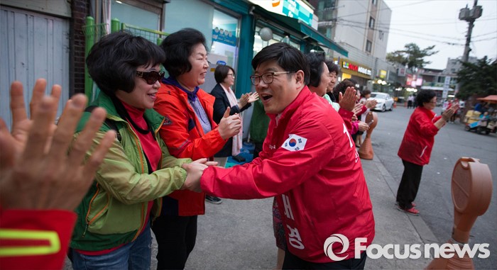 (서울=포커스뉴스) 6일 오후 서울 강동구 천호동 인근의 한 아파트 앞에서 이재영 새누리당 후보가 유세를 펼치고 있다.