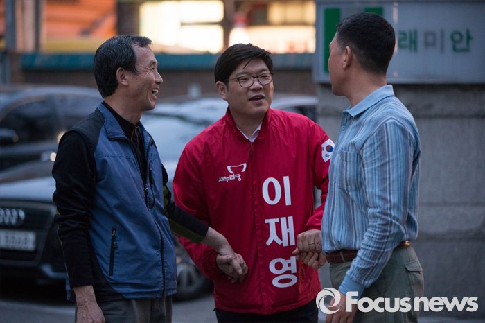 (서울=포커스뉴스) 6일 오후 서울 강동구 천호동 인근의 한 아파트 앞에서 이재영 새누리당 후보가 유세를 펼치고 있다.