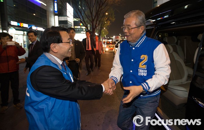 (서울=포커스뉴스) 김종인 더불어민주당 대표가 6일 오후 서울 강동구 이마트 앞에서 심재권 후보의 유세를 지원하며 심 후보와 악수를 하고 있다.