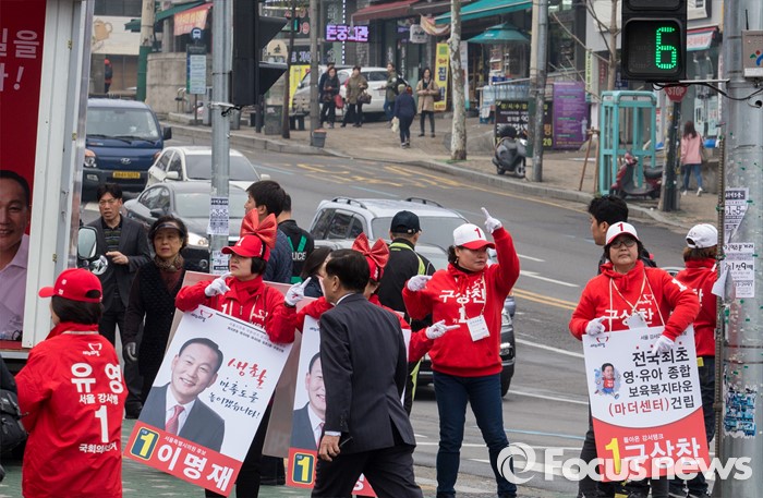 (서울=포커스뉴스) 7일 오전 서울 강서구 화곡역 사거리에서 열린 강서구갑ㆍ을ㆍ병 후보 합동 지원유세에서 선거사무원들이 선거운동을 하고 있다.