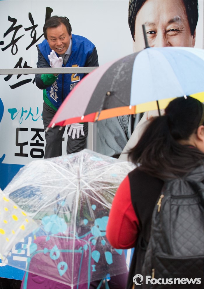 (청주=포커스뉴스) 7일 오전 충북 청주시 흥덕구 복대사거리에서 도종환 더불어민주당 후보가 출근길 시민들에게 인사를 하며 지지를 호소하고 있다.