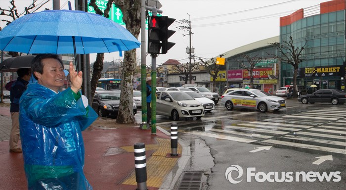 (청주=포커스뉴스) 7일 오전 충북 청주시 흥덕구 복대사거리에서 도종환 더불어민주당 후보가 출근길 시민들에게 인사를 하며 지지를 호소하고 있다.