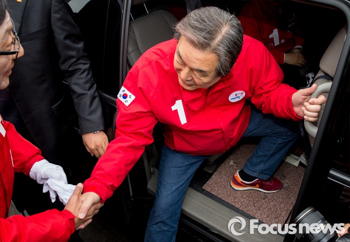 (서울=포커스뉴스) 7일 오전 서울 강서구 화곡역 사거리에서 강서구갑ㆍ을ㆍ병 후보 합동 지원유세에 나선 김무성 새누리당 대표가 유영 강서구병 후보와 악수하고 있다.