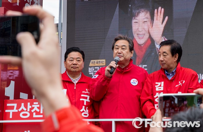 (서울=포커스뉴스) 7일 오전 서울 강서구 화곡역 사거리에서 강서구갑ㆍ을ㆍ병 후보 합동 지원유세에 나선 김무성 새누리당 대표가 후보들과 함께 유권자들에게 지지를 호소하고 있다.