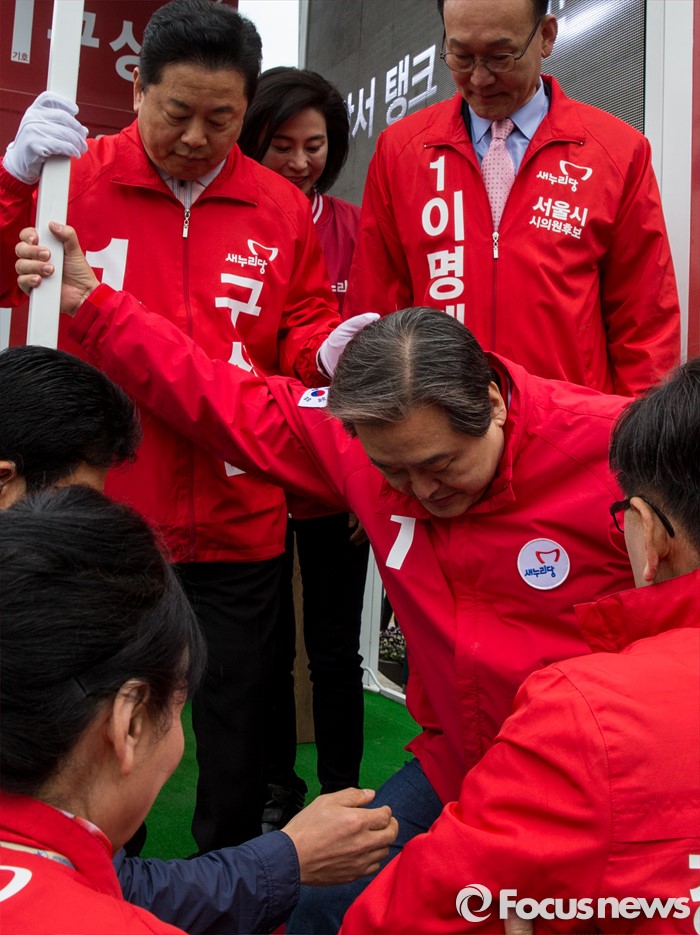 (서울=포커스뉴스) 7일 오전 서울 강서구 화곡역 사거리에서 강서구갑ㆍ을ㆍ병 후보 합동 지원유세에 나선 김무성 새누리당 대표가 유세를 마친 후 차량에서 내려오고 있다.