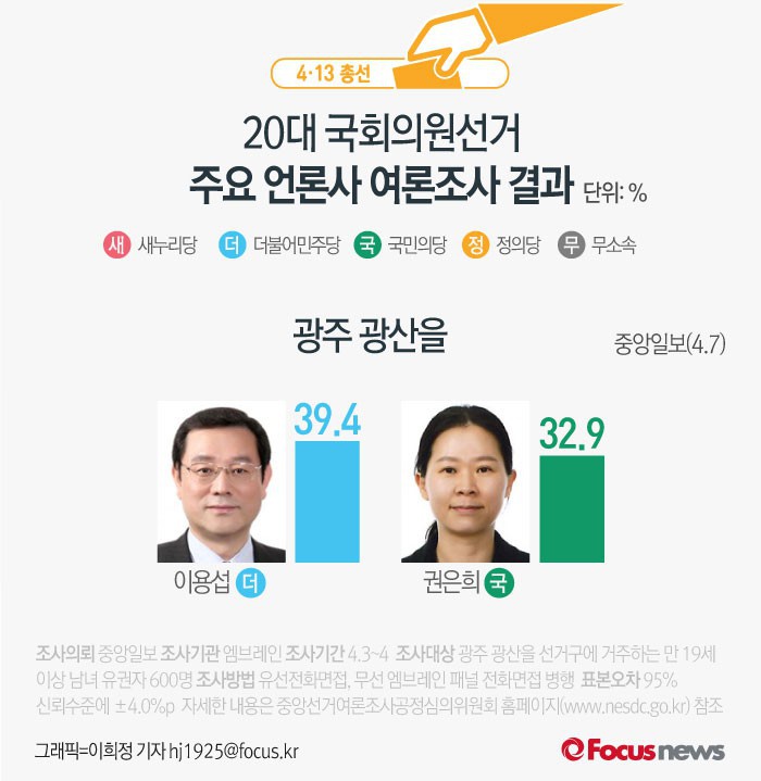 (서울=포커스뉴스) 중앙일보가 엠브레인에 의뢰해 7일 발표한 광주 광산을 여론조사 결과에 따르면 더불어민주당 이용섭 후보의 지지율은 39.4%, 국민의당 권은희 후보의 지지율은 32.9%로 나타났다.