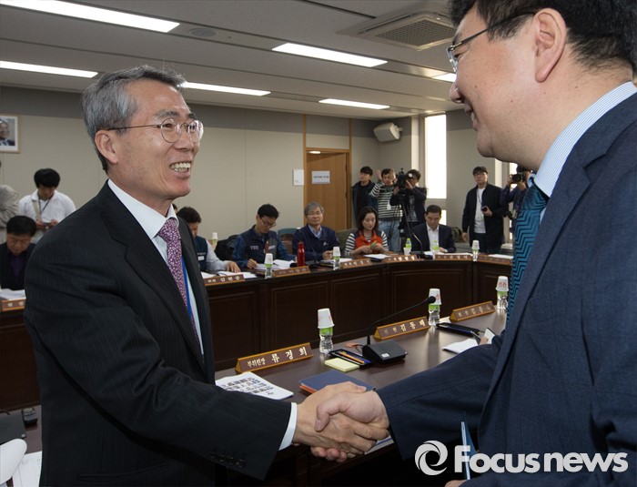 (세종=포커스뉴스) 7일 오전 세종시 정부세종청사 고용노동부 최저임금위원회 대회의실에서 열린 제1차 전원회의에서 박준성 위원장이 정부측 참석자와 인사를 나누고 있다.