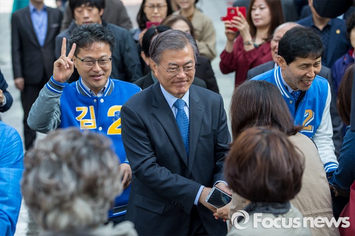 (군포=포커스뉴스) 문재인 더불어민주당 전 대표가 7일 오전 경기도 군포시 산본중심상가를 방문해 이학영 군포시을 후보, 김정우 군포시갑 후보와 함께 유권자들에게 한 표를 호소 하고 있다.