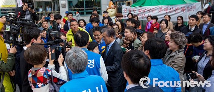 (군포=포커스뉴스) 문재인 더불어민주당 전 대표가 7일 오전 경기도 군포시 산본중심상가를 방문해 유권자들에게 이학영 군포시을 후보, 김정우 군포시갑 후보 지지를 호소 하고 있다.