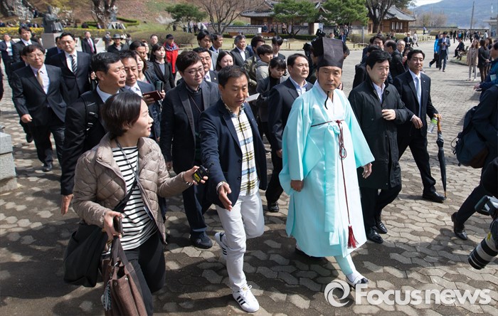 (남양주=포커스뉴스) 7일 오전 경기 남양주 다산유적지에서 손학규 전 더불어민주당 상임고문이 다산 정약용 선생 180주기 묘제·헌다례를 마치고 이동하고 있다.