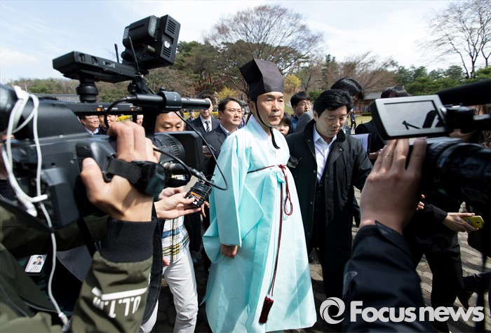 (남양주=포커스뉴스) 7일 오전 경기 남양주 다산유적지에서 손학규 전 더불어민주당 상임고문이 다산 정약용 선생 180주기 묘제·헌다례를 마치고 이동하고 있다.