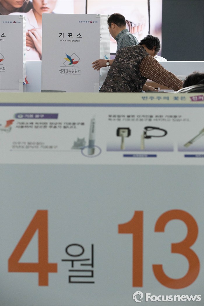 (서울=포커스뉴스) 20대 총선을 6일 앞둔 7일 오전 서울 용산구 서울역 3층 맞이방에 사전투표소가 설치되고 있다.