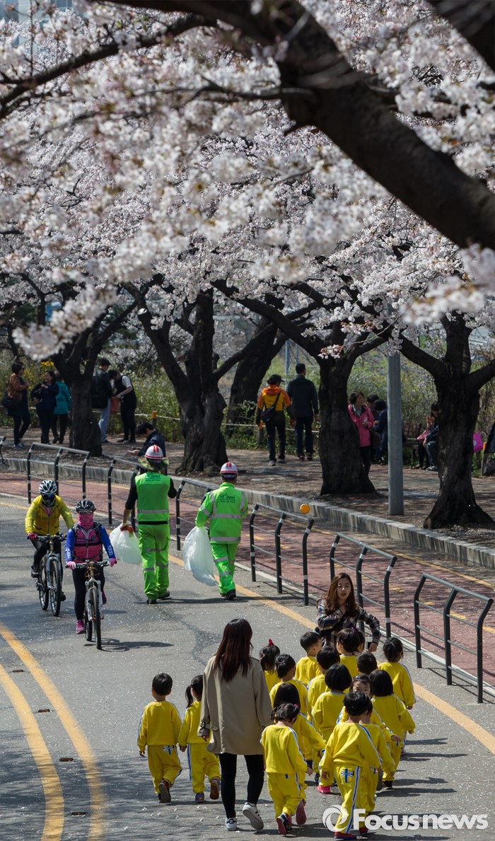(서울=포커스뉴스) 7일 오전 서울 여의도 윤중로 일대에서 열린 벚꽃축제를 찾은 어린이들이 나들이를 즐기고 있다.