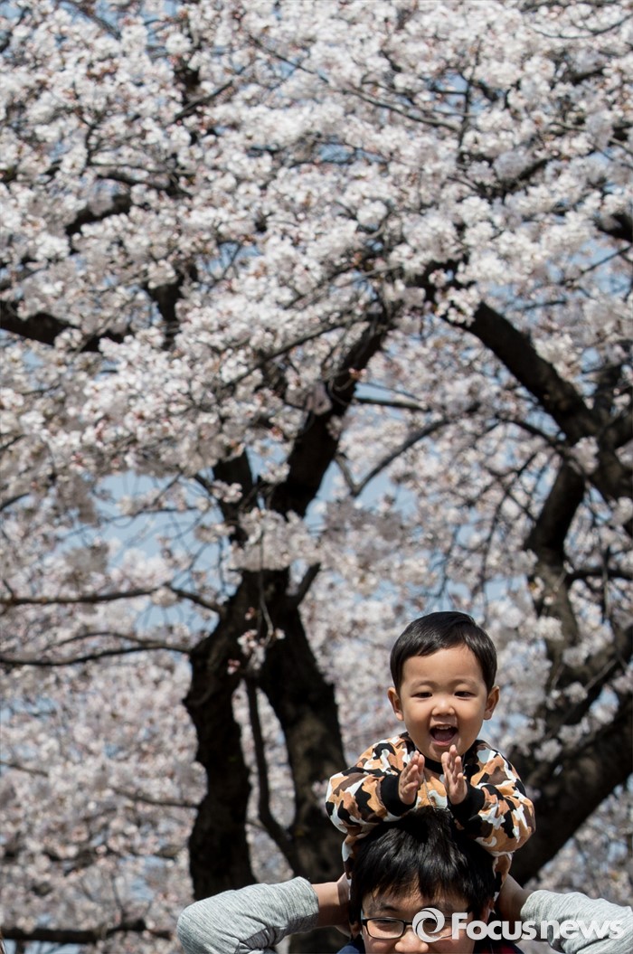 (서울=포커스뉴스) 7일 오전 서울 여의도 윤중로 일대에서 열린 벚꽃축제를 찾은 어린이가 아빠 어깨 위에서 활짝 웃고 있다.