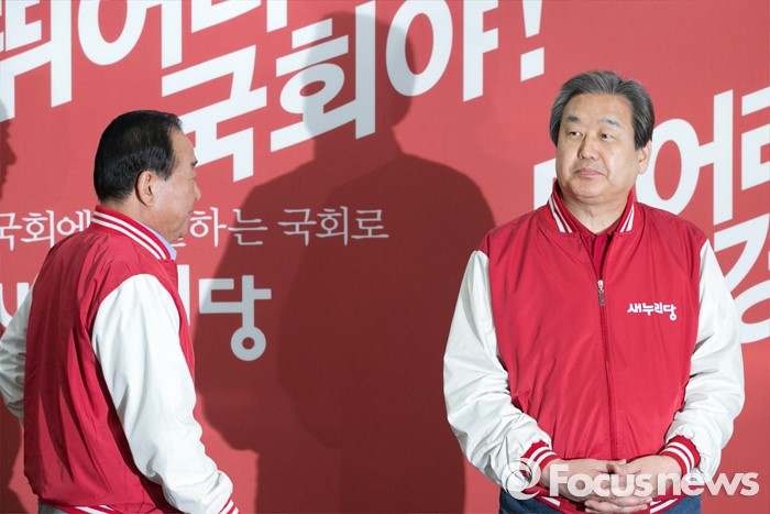 (서울=포커스뉴스) 김무성(오른쪽) 새누리당 대표가 7일 오전 서울 여의도 당사에서 열린 공동선대위원장 긴급회의에 참석해 기다리는 동안, 서청원 최고위원이 김 대표 옆을 지나고 있다.