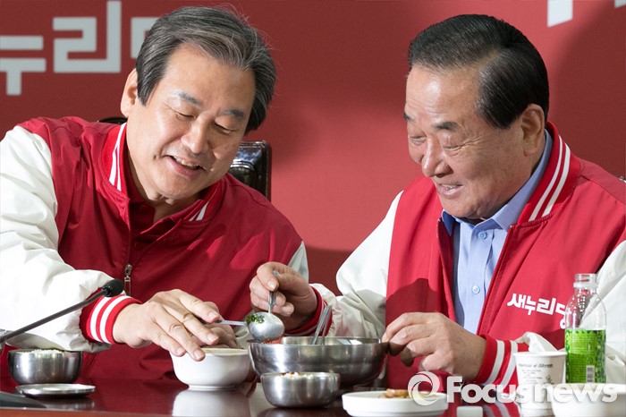 (서울=포커스뉴스) 7일 오전 서울 여의도 새누리당사에서 김무성(왼쪽) 대표가 공동선대위원장 긴급회의에 참석해, 서청원 최고위원의 비빔밥에 고추장을 넣어주고 있다.