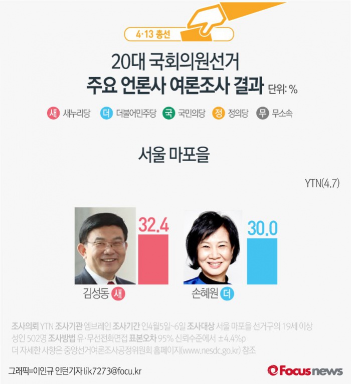 (서울=포커스뉴스) YTN이 여론조사기관 엠브레인에 의뢰해 7일 발표한 결과에 따르면 서울 마포을에서 새누리당 김성동 후보의 지지율은 32.4%, 더불어민주당 손혜원 후보의 지지율은 30.0%인 것으로 나타났다.