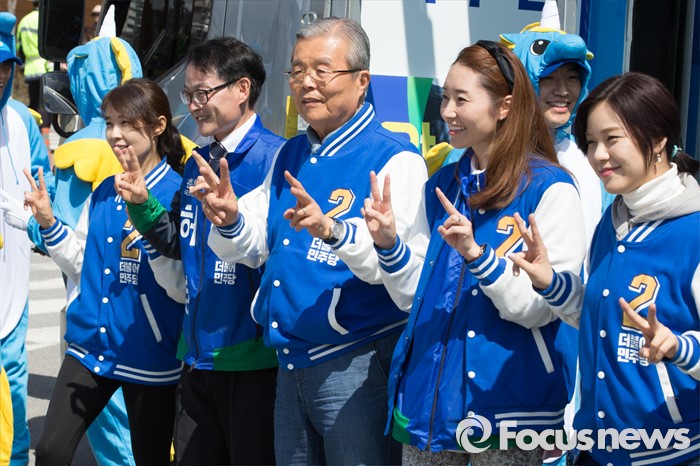 (춘천=포커스뉴스) 7일 강원도 춘천풍물시장 인근에서 김종인 더불어민주당 비대위 대표와 허영 더불어민주당 춘천 후보가 유권자들에게 지지를 호소하고 있다.